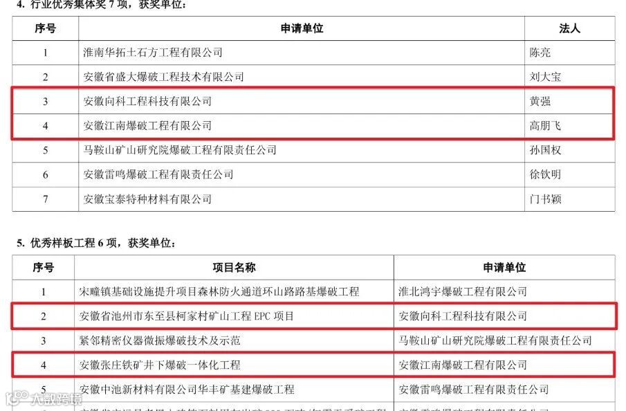 2025年,江南化工所属新疆天河爆破“新疆凯岭阿尔格敏露天煤矿智能穿爆工程”被评为新疆爆破行业样板工程,中岩恒泰玉龙河项目部一同获评;江南爆破“张庄铁矿井下爆破一体化工程”及安徽向科“柯家村矿山工程EPC项目”获评安徽省工程爆破协会年度优秀样板工程;江南爆破“淮南市废旧电工建(构)筑物群爆破拆除工程”获安徽省工程爆破协会2025年度科学技术奖特等奖。