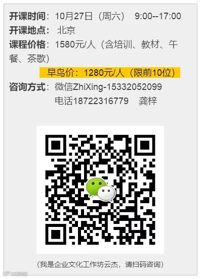 10月27日,知行培训携手阿里巴巴文化布道官王建和老师开发企业文化落地实操课程,课程从客户价值追根溯源出如何寻找企业的使命和宗旨,强化“从未来看现在”的能量,找出愿景的关键点在于共同看见。重点讲授如何通过文化的手段激发个体的心力、脑力和体力,助力企业活力。