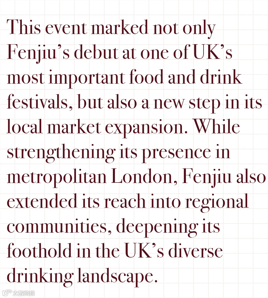 As the first Chinese baijiu brand to appear at the festival, Fenjiu’s presence reflected its rising influence on the international stage. Cheng International hosted daily masterclasses, engaging British consumers with baijiu’s flavours, pairings, and cultural background.