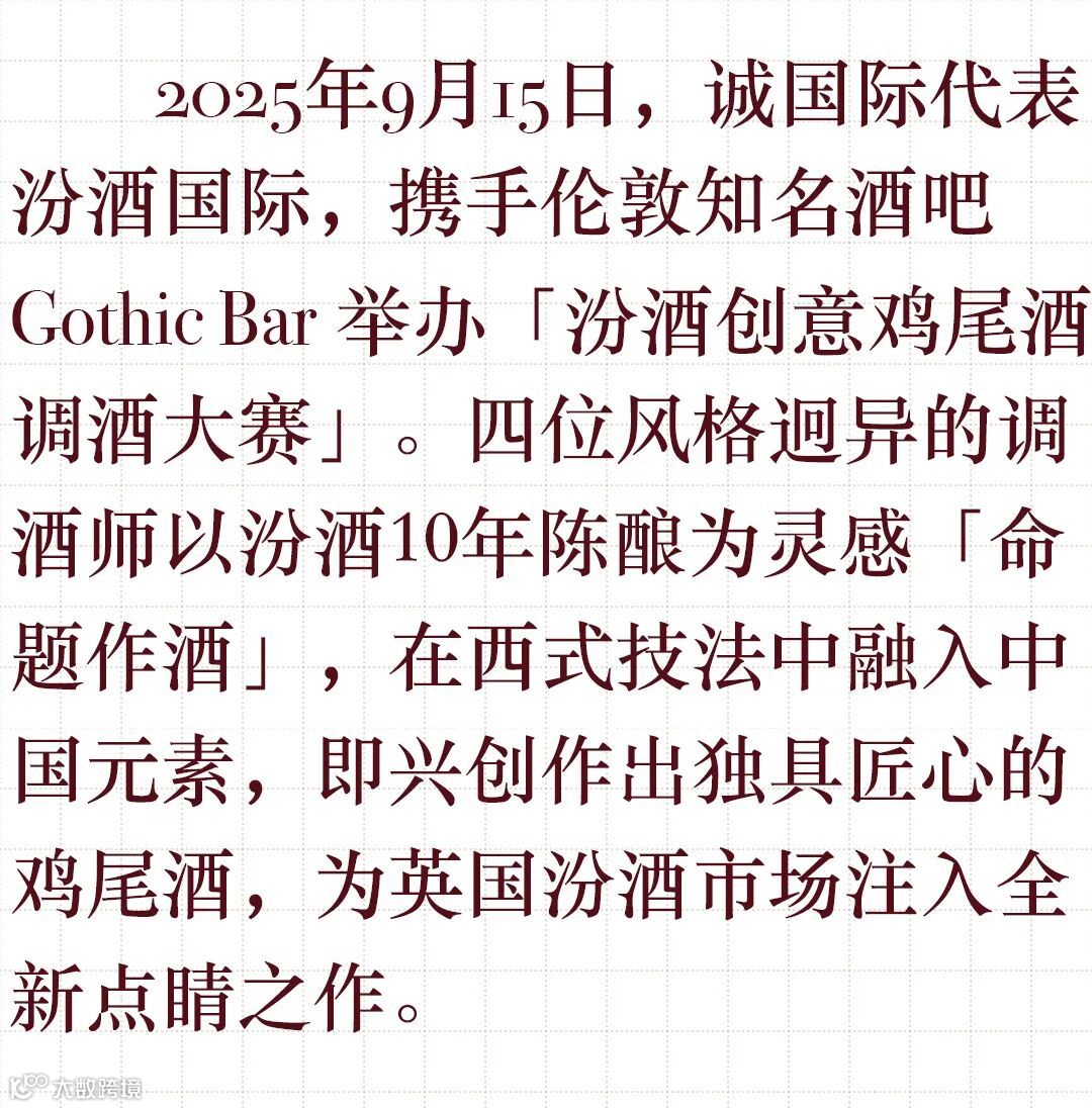 值得一提的是,本次汾酒鸡尾酒比赛是Gothic Bar最后一次承接私人活动。这场融合中国酒文化与当代调酒美学的特别赛事,为来宾带来独到体验,同时为这座承载风格与记忆的酒吧画下难忘的阶段性句点。