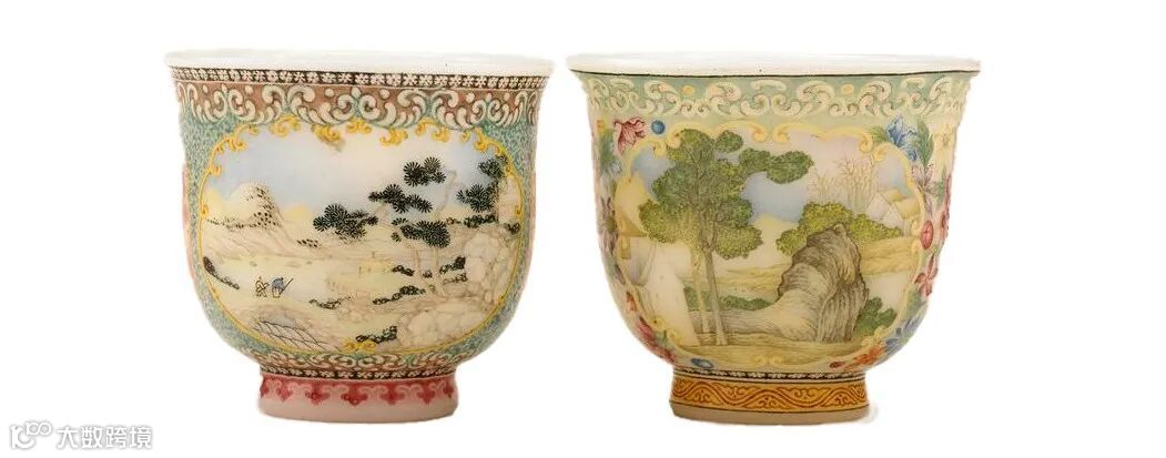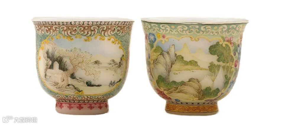 若说十二月花神杯承载着东方诗酒文化的风雅,展现了中国人对四时节令的吟咏与敬畏,那么玻璃画珐琅山水图酒杯,则诉说着另一种「文化交融」的故事。