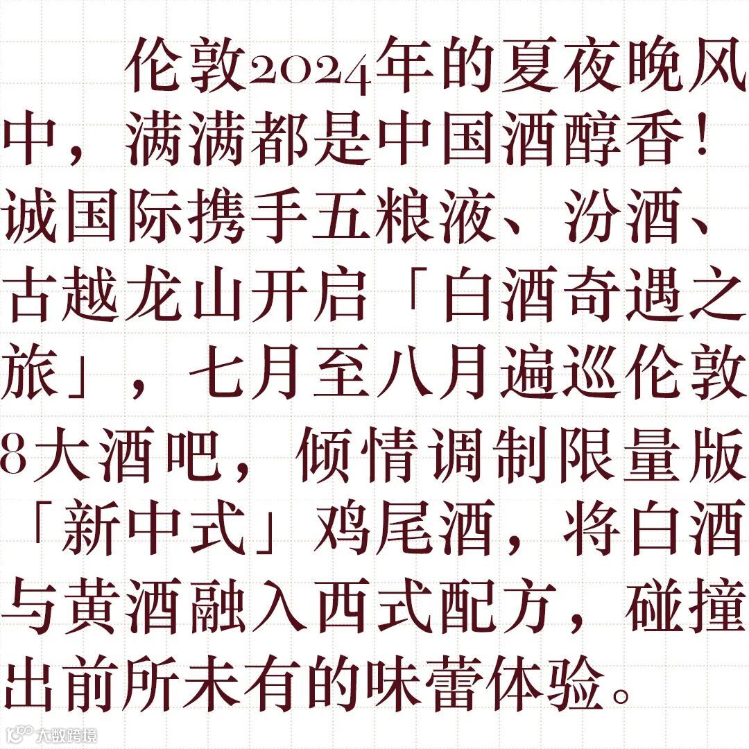 1. 2024年活动期间,前往诚国际「白酒奇遇之旅」合作伦敦各酒吧,点单品尝任意限时白酒/黄酒鸡尾酒(五粮液、汾酒或古越龙山)。