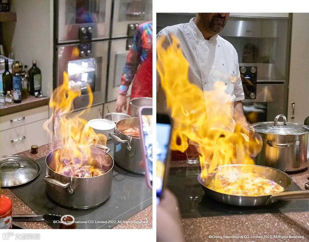 Stefano还现场演示了西式烹饪常出现的「flambé」手法,也就是在将汾酒加入热锅后,点火燃烧,将多余的酒精炙烤掉,同时将酒本身的醇厚味道放大、更深层次融入到菜式的味道中,毫不意外引来嘉宾们兴奋不已的轻声惊呼▼