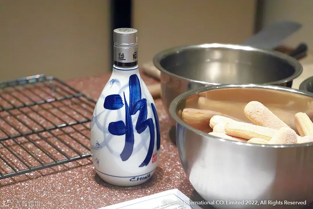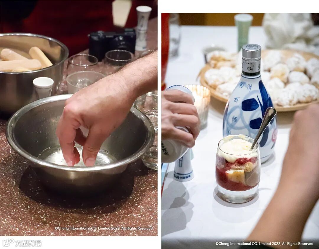 意式巧克力多层乳脂松糕,其中的手指饼干在摆盘前用青花汾酒20年42度浸泡过,类似提拉米苏用浓缩咖啡或咖啡酒浸泡饼干的手法,让青花汾酒的花果香调与甜品中的卡仕达酱、树莓汁相互衬托,更显意式甜品与汾酒的适配度。
