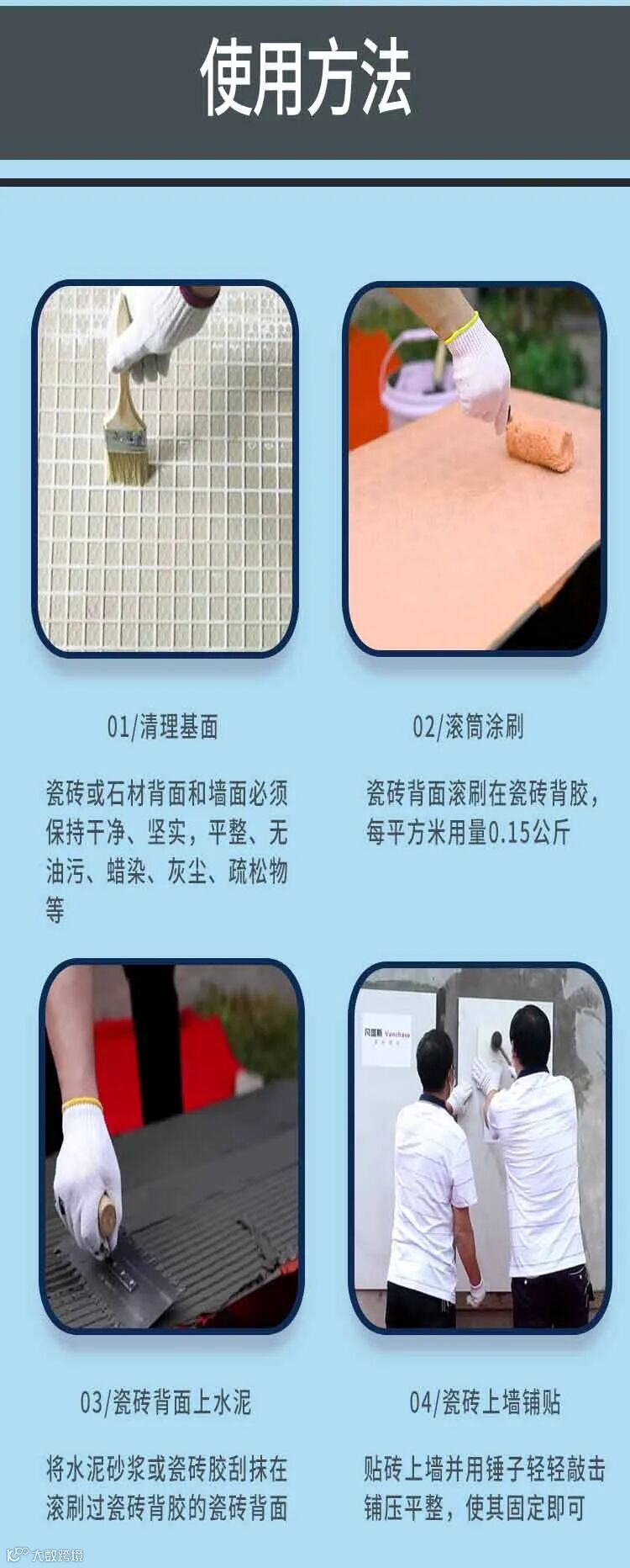 直接开桶用滚筒刷,薄薄刷 1mm 厚(别刷太厚浪费钱!),刷完马上贴瓷砖,不用等干不用吹,贴完敲一敲,空鼓?不存在!