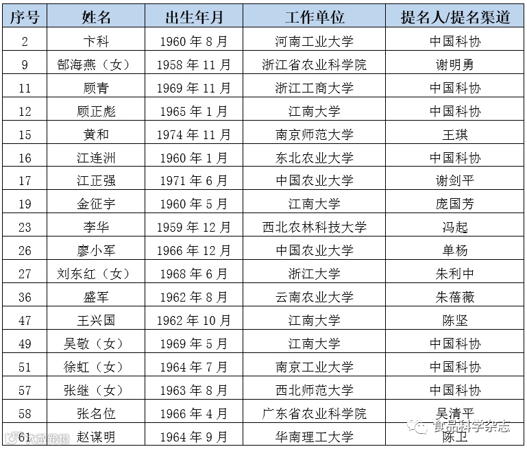 农业学部院士增选有效候选人