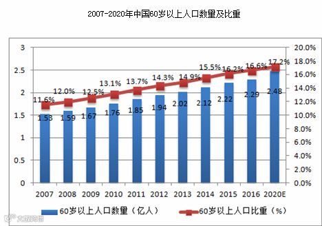 中国人口老龄化日趋严重。2017年年末中国大陆总人口(包括31个省、自治区、直辖市和中国人民解放军现役军人,不包括香港、澳门特别行政区和台湾省以及海外华侨人数)139008万人,比上年末增加737万人。从年龄构成看,16至59周岁的劳动年龄人口为90199万人,占总人口的比重为64.9%;60周岁及以上人口24090万人,占总人口的17.3%,其中65周岁及以上人口15831万人,占总人口的11.4%这将产生一个庞大的养老产业链。所以必须将实施健康老龄化战略纳入大健康的长期规划。