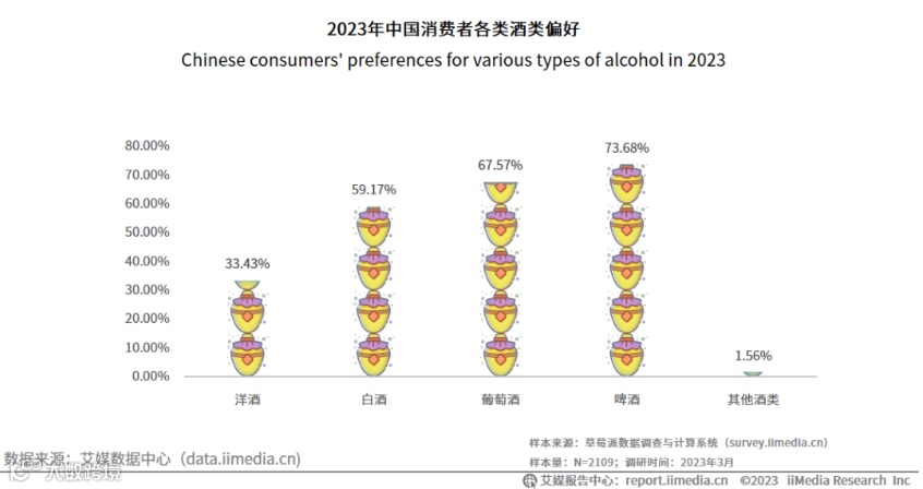 2023年中国酒类消费者偏好啤酒、葡萄酒、白酒、洋酒的比例分别为:73.68%、67.57%、59.17%、33.43%。