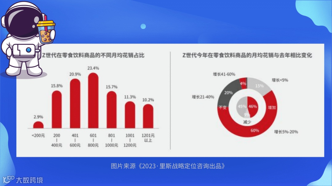 Z世代将逐渐成为零食饮料行业的消费主力军。从人数规模来看,Z世代已成长为中坚力量。具体而言,全国80%以上的Z世代群体,每月的零食饮料花费在400元以上,即日均消费在10元以上。其中,一二线城市的Z世代群体里有40%每月在零食饮料花费在800元以上,有21%每月在食品饮料上的开销高达1000元及以上。(数据来源《2023·里斯战略定位咨询出品》)