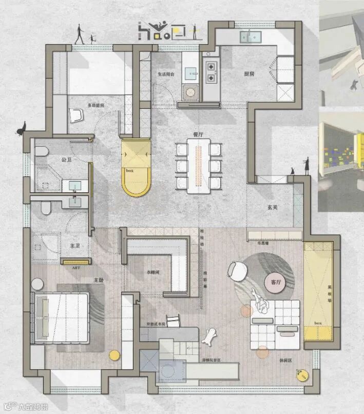 下面这个图,是室内设计联盟比赛多次金奖获得者包子(岑梓濠)的方案,从他的方案里能看到从容和淡定,以及对当下生活方式的洞察。