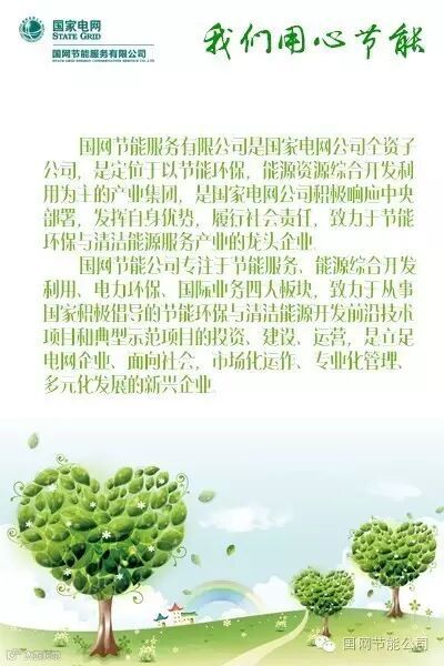 国网节能服务有限公司作为央企骨干节能环保企业,自成立以来,始终围绕国家和社会重大需求,秉持“开放创新、和谐共赢”的经营理念,诚信经营、科学发展,兼顾企业效益与社会责任,努力打造国内最具综合服务能力和持续创新能力的节能与能源开发及综合服务供应商,用最优质的服务,为客户创造价值,为社会创造财富。国网节能服务有限公司愿与各方携手共进,合作共赢,共同推动经济社会绿色发展,为建设“美丽中国”贡献力量。
