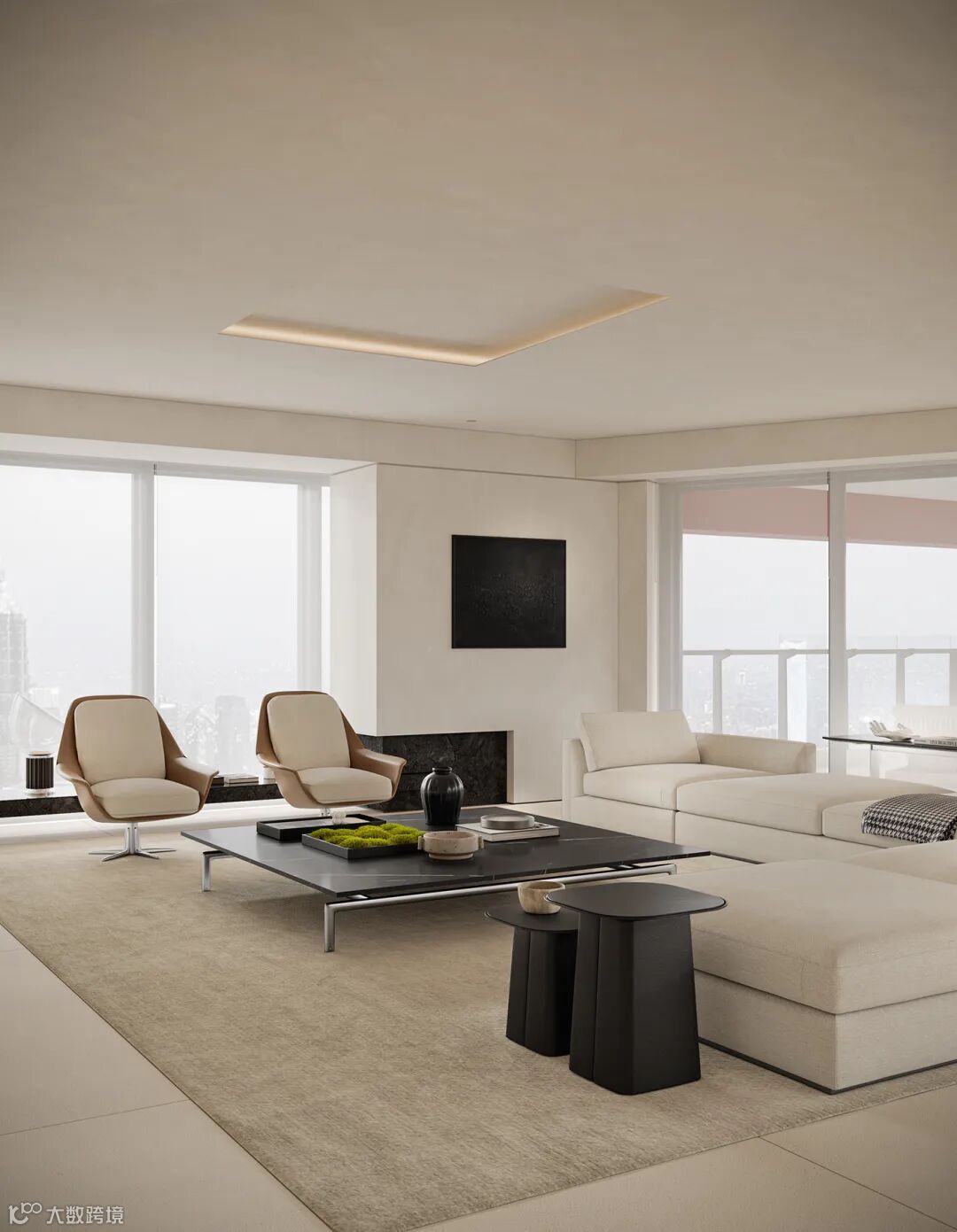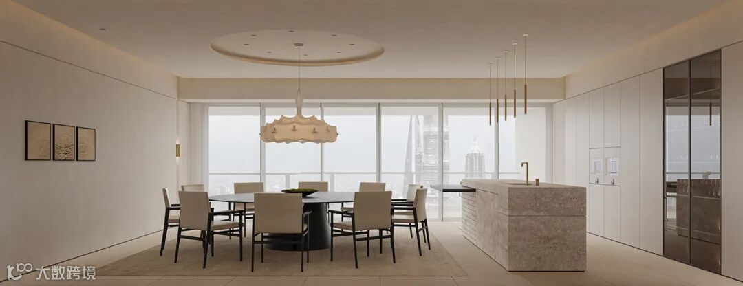 这是一个位于都市的大平层项目,采用极简的设计手法,简单克制的装饰搭配淡雅的暖白色,中和空间的冷峻气息。