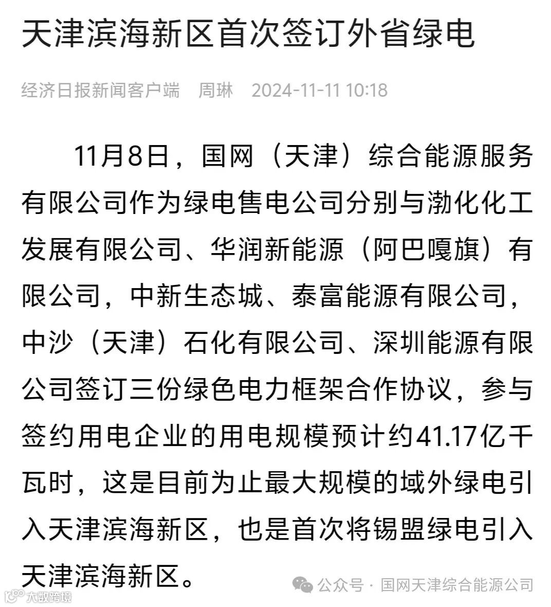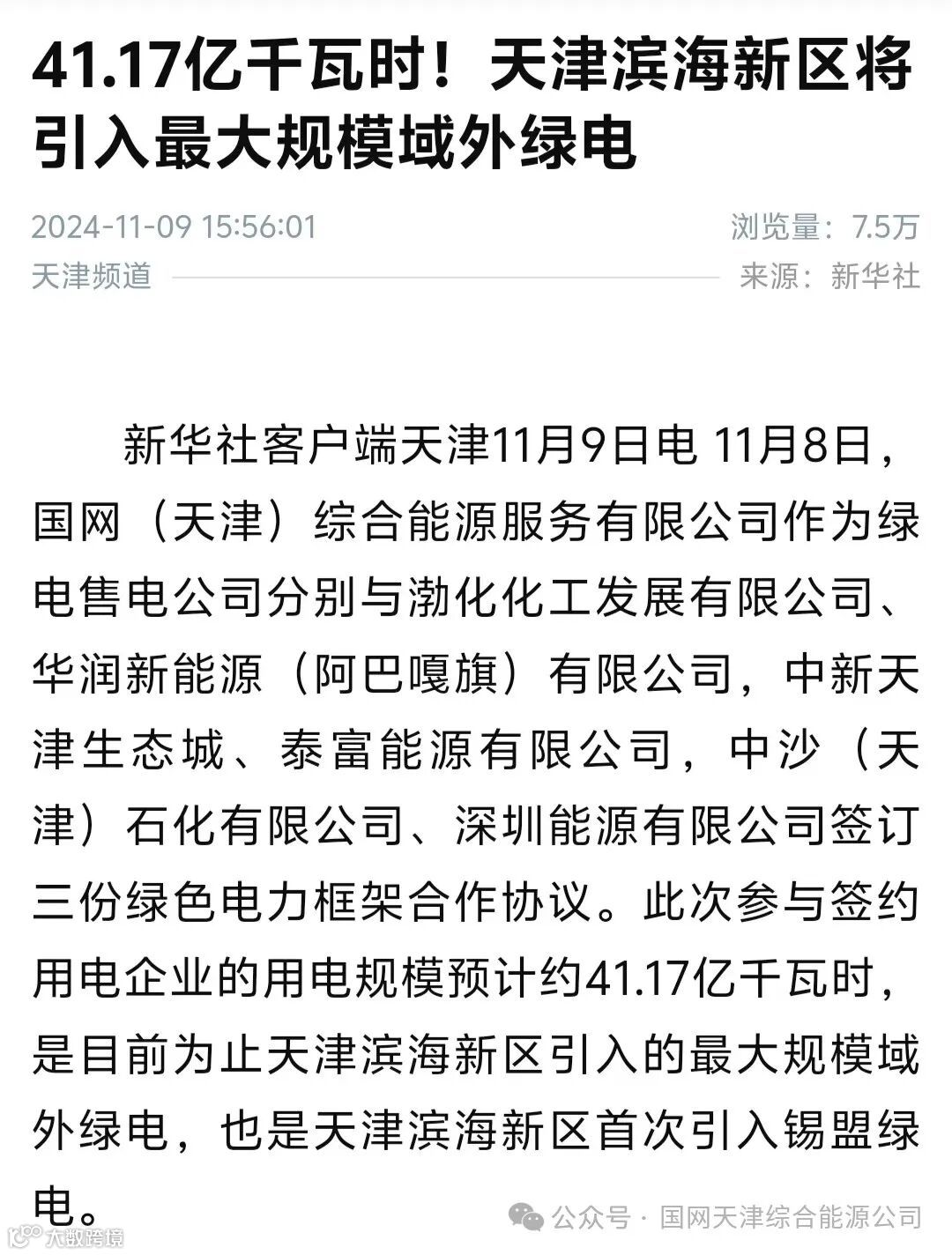 《天津滨海新区首次签订外省绿电》
