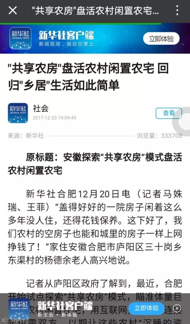 新华社合肥12月20日电(记者马姝瑞、王菲)“盖得好好的一院房子闲着这么多年没人住,还得花钱保养。这下好了,我们农村的空房子也能和城里的房子一样上网挣钱了!”家住安徽合肥市庐阳区三十岗乡东渠村的杨德余老人高兴地说。