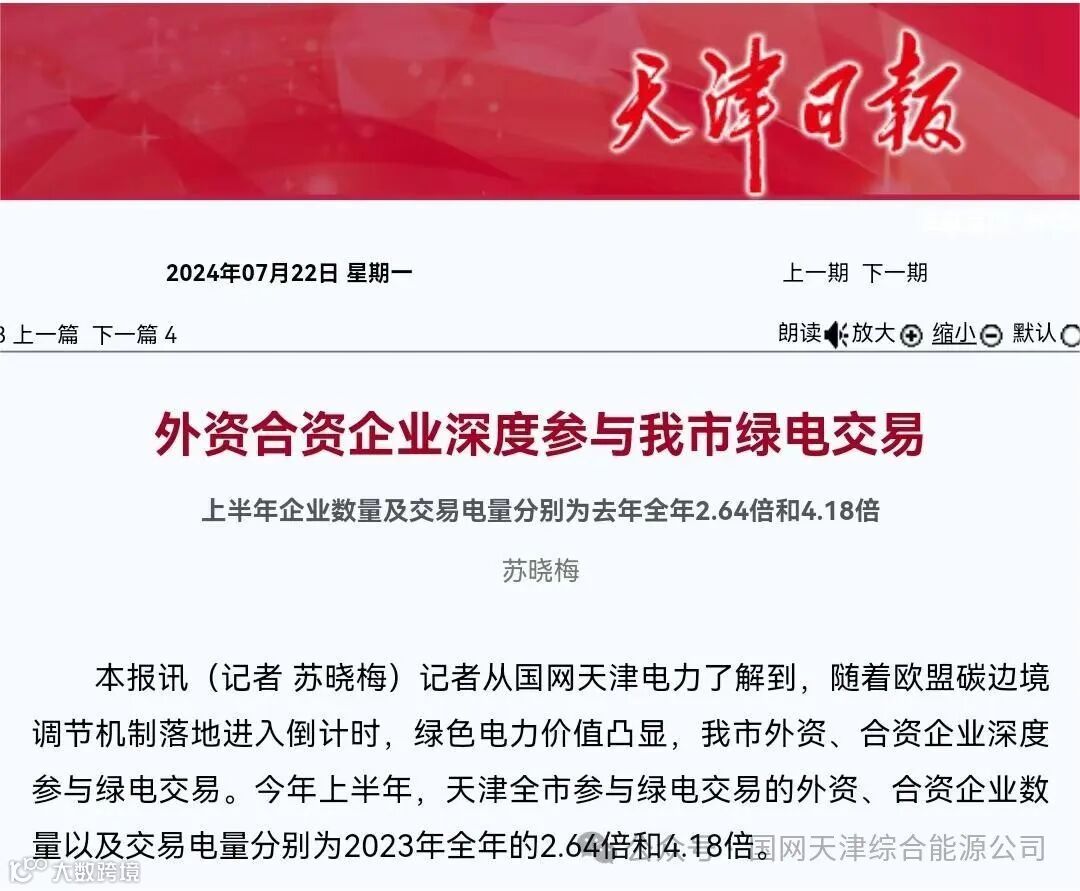 中国绿电正在深度参与外资企业的碳达峰、碳中和行动:2024年上半年,天津全市参与绿电交易的外资、合资企业数量达到174家,交易电量达到23亿千瓦时,分别是2023年全年的2.64倍和4.18倍。