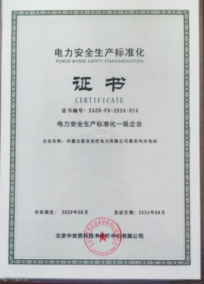 2024年,江南化工新能源公司在电力安全生产标准化建设工作中屡获佳绩,13家风光电站全部获评电力安全生产标准化一级、二级企业。其中,新能源内蒙古光伏公司赛音风光电站、宁夏公司清水河第一风电场、山西公司双字坪风电场被评为“电力安全生产标准化一级企业”,达到新能源行业安全生产标准化最高水平。