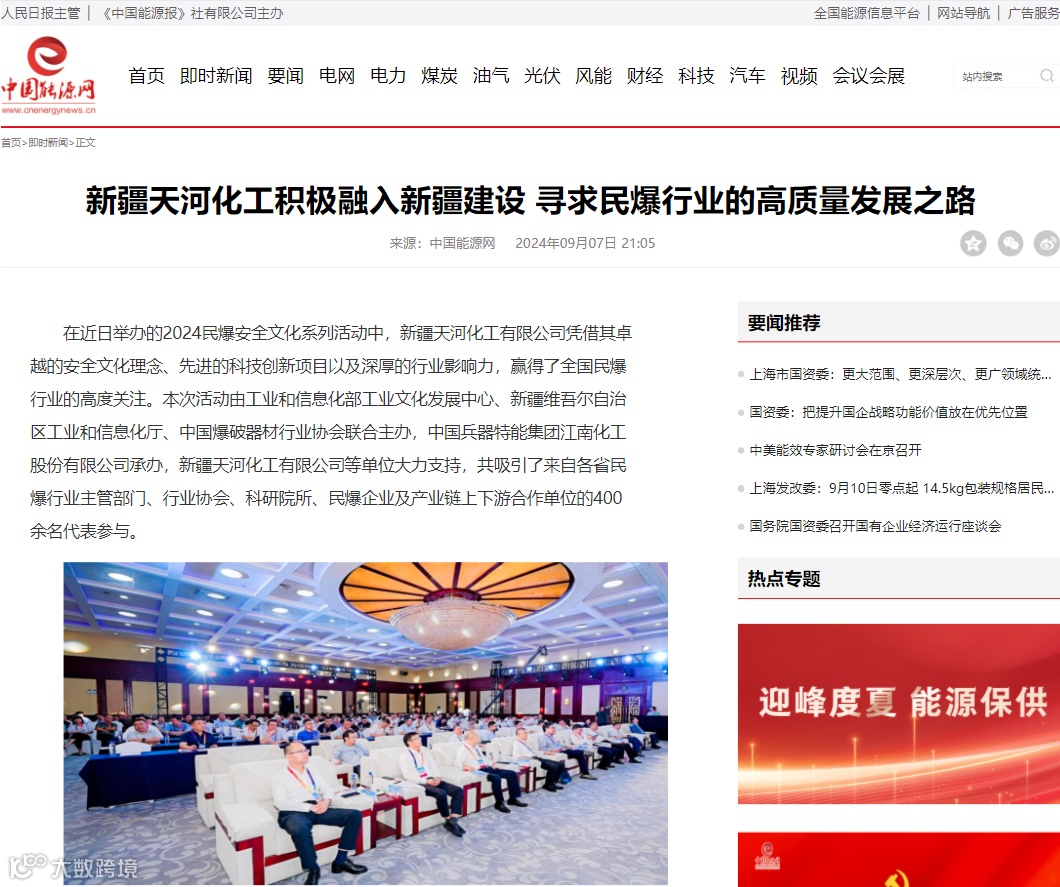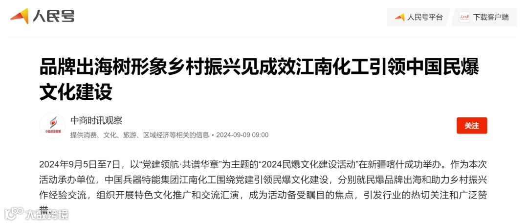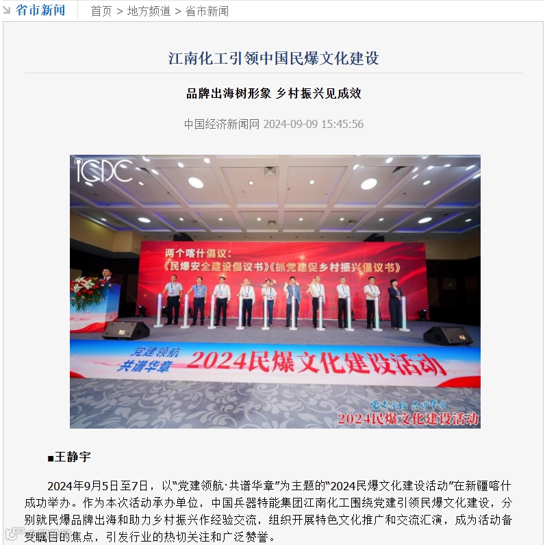 江南化工承办的2024民爆文化建设活动在新疆喀什成功举办。人民日报客户端、新华财经客户端、光明网、中国日报网、环球网、中国经济时报网、中国能源网等中央主流媒体对活动开展情况和江南化工品牌出海、乡村振兴等工作成效进行了报道与转载。