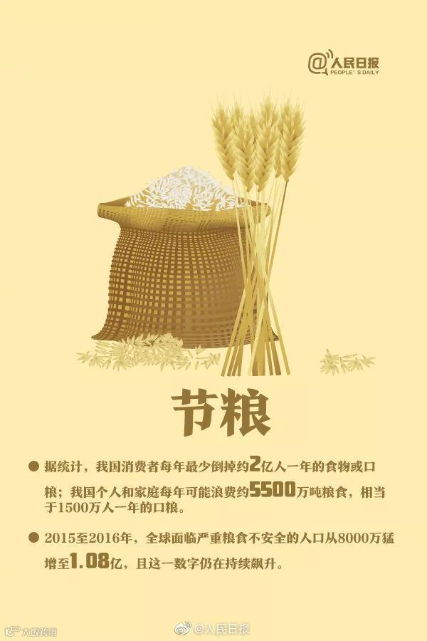 “谁知盘中餐,粒粒皆辛苦”,可是现在浪费粮食的现象仍比较严重。而少浪费0.5千克粮食(以水稻为例),可节能约0.18千克标准煤,相应减排二氧化碳0.47千克。如果全国平均每人每年减少粮食浪费0.5千克,每年可节能约24.1万吨标准煤,减排二氧化碳61.2万吨。