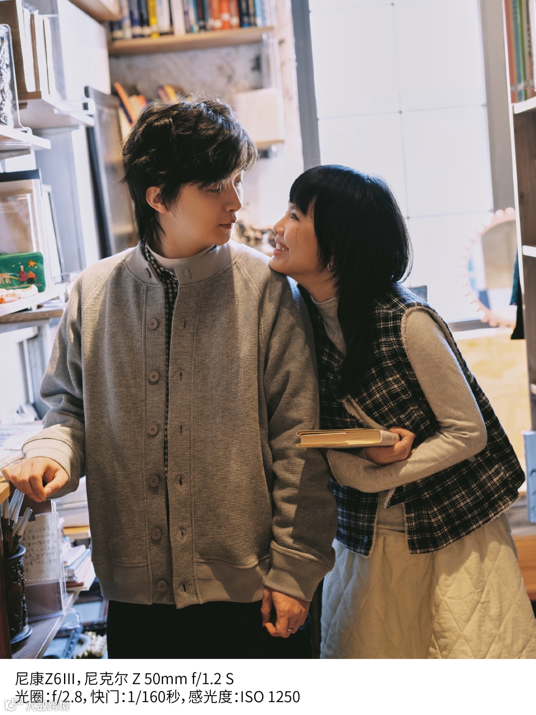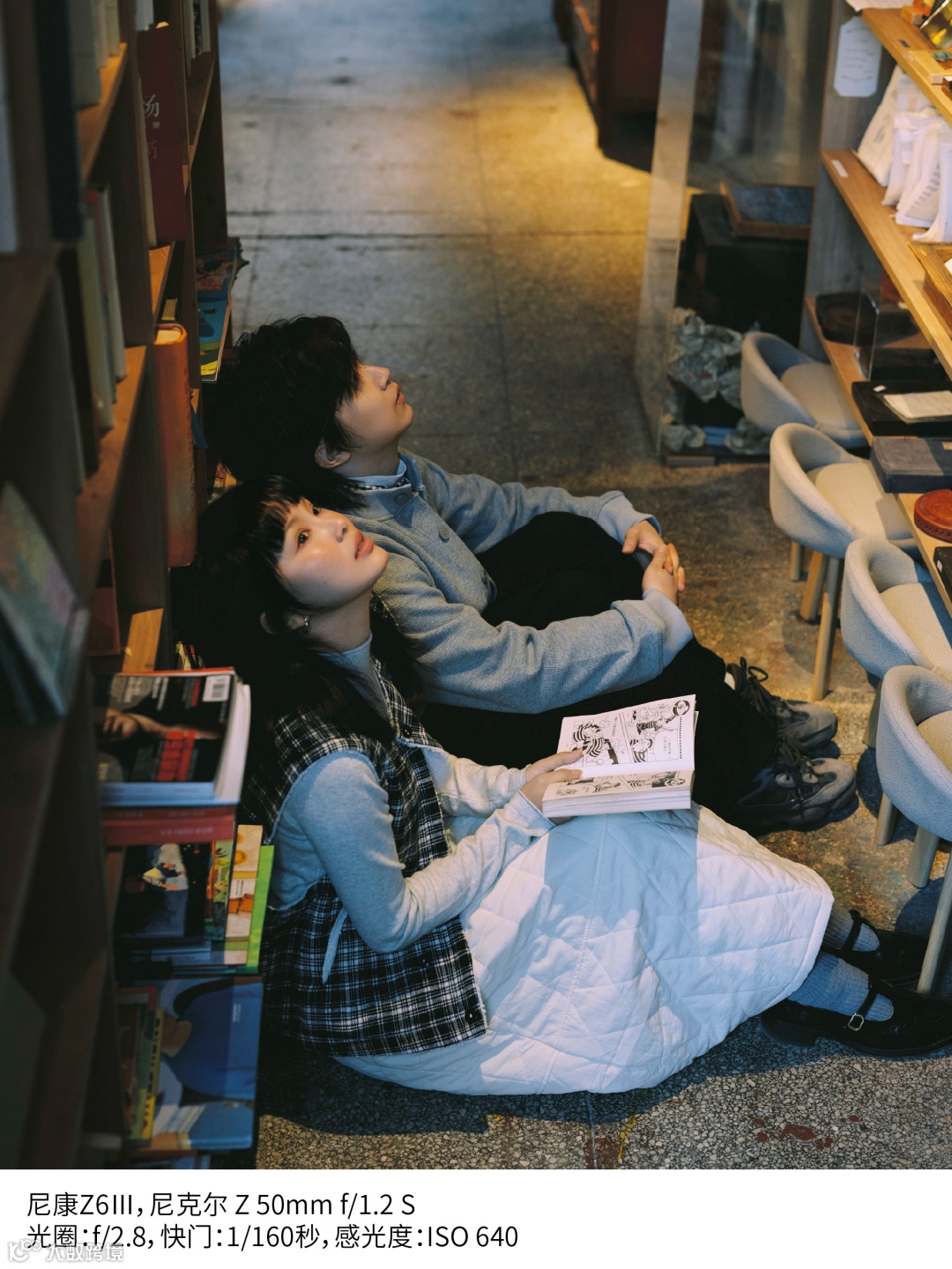 在书店拍摄时,顶光容易在面部形成阴影,这时不妨让模特坐下,调整姿势,巧妙避开阴影。在拍摄过程中,我会观察他们互动的状态,捕捉松弛瞬间,这样拍出来的照片才更加自然生动。