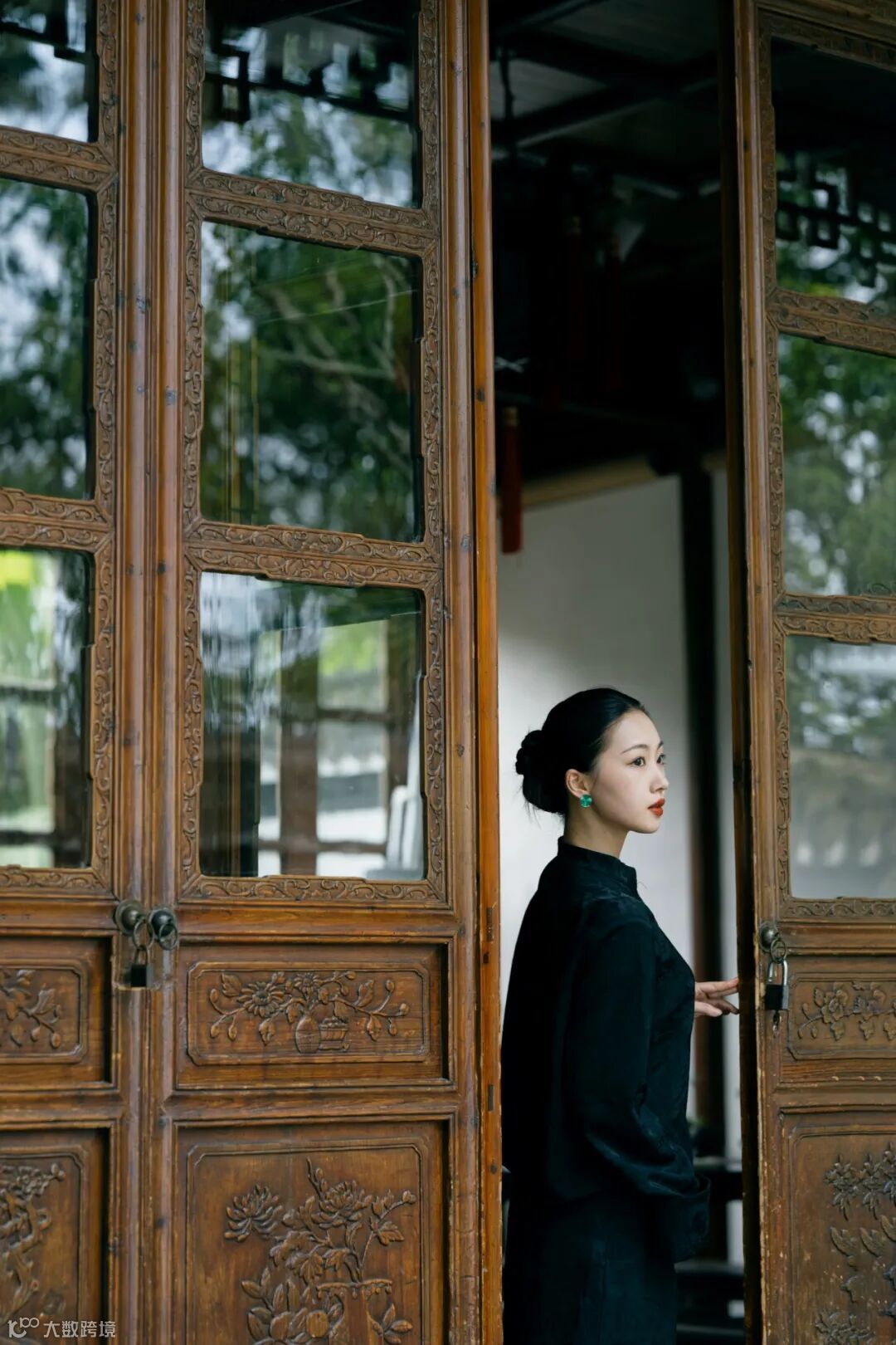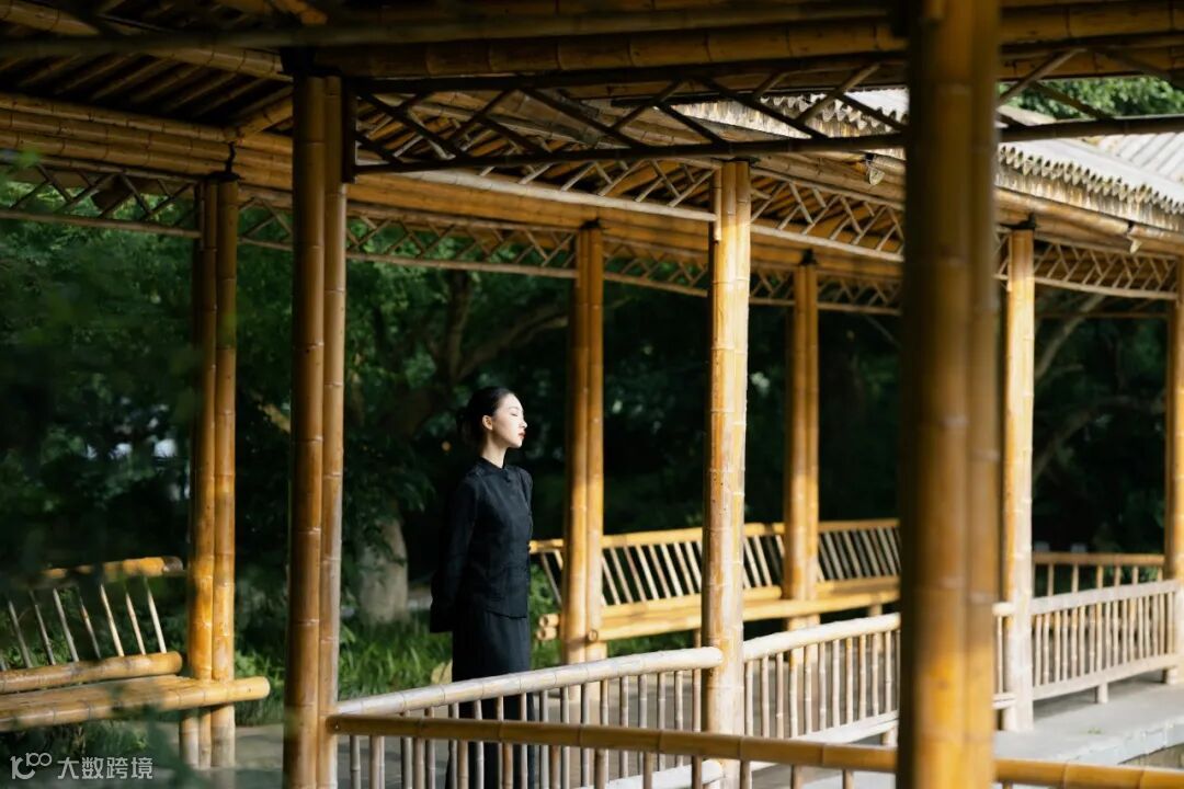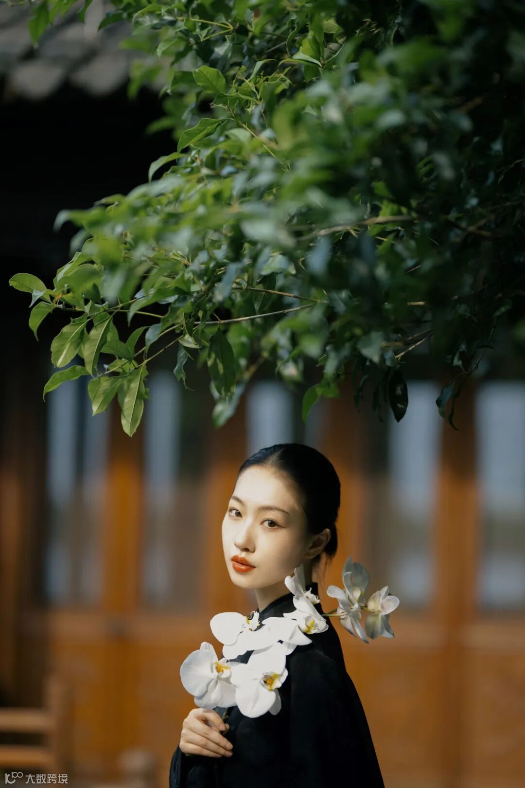 在拍摄传统环境时,我们需要考量原始景观的设计精髓,再融入个人的美学理解。为了与古朴的环境相得益彰,我们为模特精心挑选了一套黑色的中式印花套装,搭配利落的中式盘发,使其整体造型既古典又富有韵味。这套服装的干净利落与有秩序感的木质门窗、连廊等元素形成完美呼应,让人物与环境在视觉上融为一体。人物自然地融入环境之中,不仅显得协调和谐,更展现出了中式独有的朴雅气质。