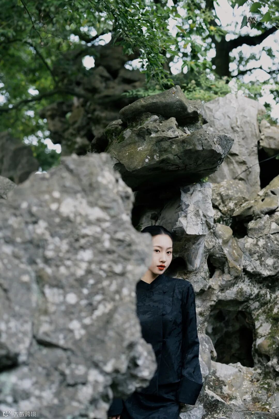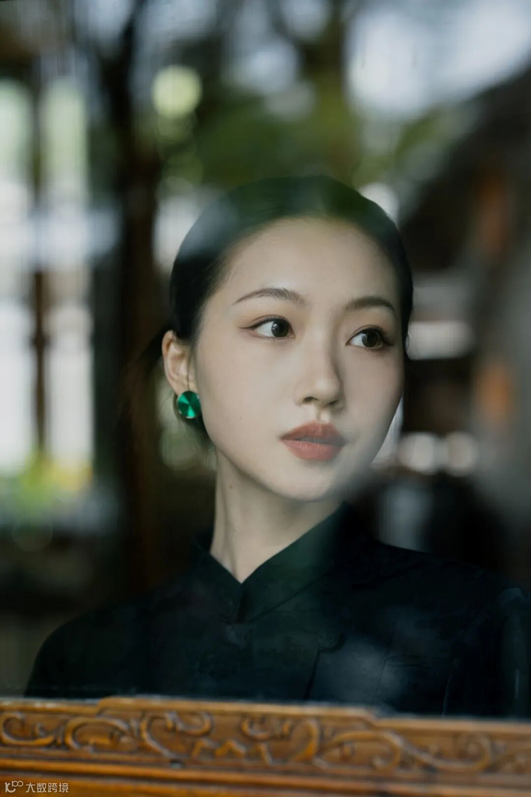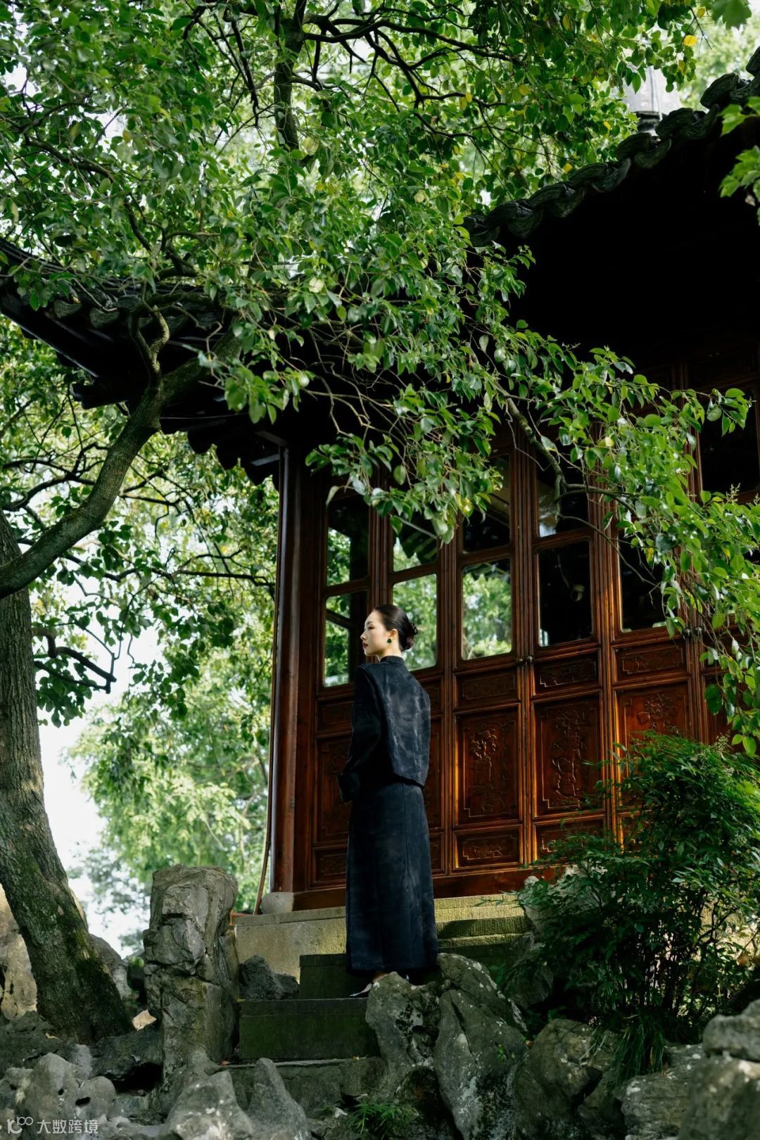 在拍摄传统环境时,我们需要考量原始景观的设计精髓,再融入个人的美学理解。为了与古朴的环境相得益彰,我们为模特精心挑选了一套黑色的中式印花套装,搭配利落的中式盘发,使其整体造型既古典又富有韵味。这套服装的干净利落与有秩序感的木质门窗、连廊等元素形成完美呼应,让人物与环境在视觉上融为一体。人物自然地融入环境之中,不仅显得协调和谐,更展现出了中式独有的朴雅气质。