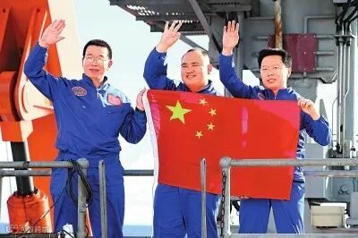 △2012年6月24日,“蛟龙”号三位试航员崔维成、叶聪、杨波(左至右)手举国旗向众人致意。