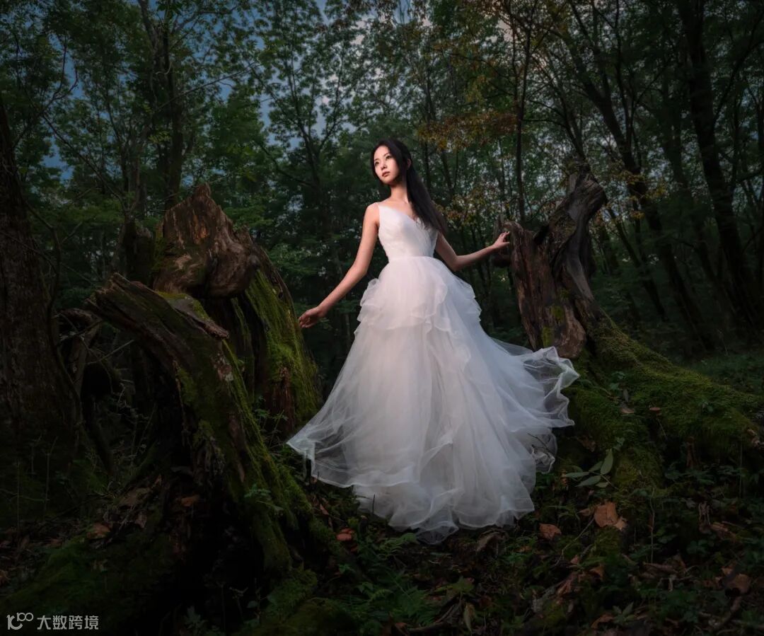 这张《林间精灵》照片是在长春原始森林里拍摄的。照片中的模特从蓝绿色的大背景中脱颖而出,营造出一种超凡脱俗的感觉。拍摄过程中,需要细致地表现苔藓的细节,同时也要对人物形象进行精致表达。为此,我们选用了GF20-35mmF4 R WR的镜头进行小光圈拍摄。1亿像素结合16bit的色深,赋予画面丰富的质感,为观众带来全新的视觉冲击和表现能力。