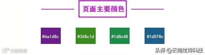 炫烨科技官网新版采用#6A1D8C紫色、#368C1D绿色、#1D8C48草绿、#1D5F8C墨蓝为新版企业颜色标识,云南炫烨科技新版统一了尊贵的紫色调,给人感觉高端、大气、上档次且尊贵,贯穿了图片设计、背景色块以及文字颜色中已达到让用户对云南炫烨科技有非常强烈的辨识度。