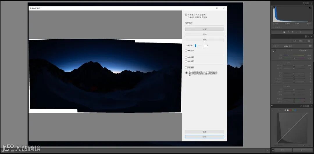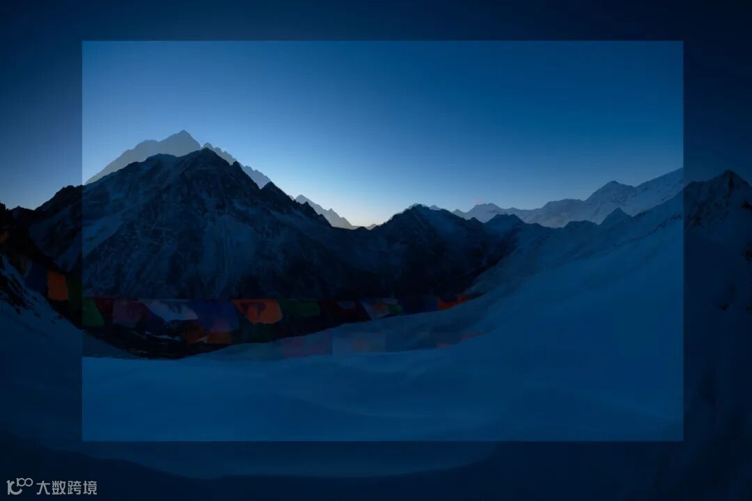 此时我尝试了另一种拍摄方式,用这样的鱼眼超广来完成大范围接片又是怎样的表现? 我使用竖拍的4张照片完成构图,覆盖了上下180°和左右的接近200°的视野,在这样的接片接完之后,我几乎没有做任何的矫正变形,只用略微裁剪,得到的画面透视非常理想,群山的细节和近处雪的纹理在晨光下勾勒出异常唯美的蓝色世界。