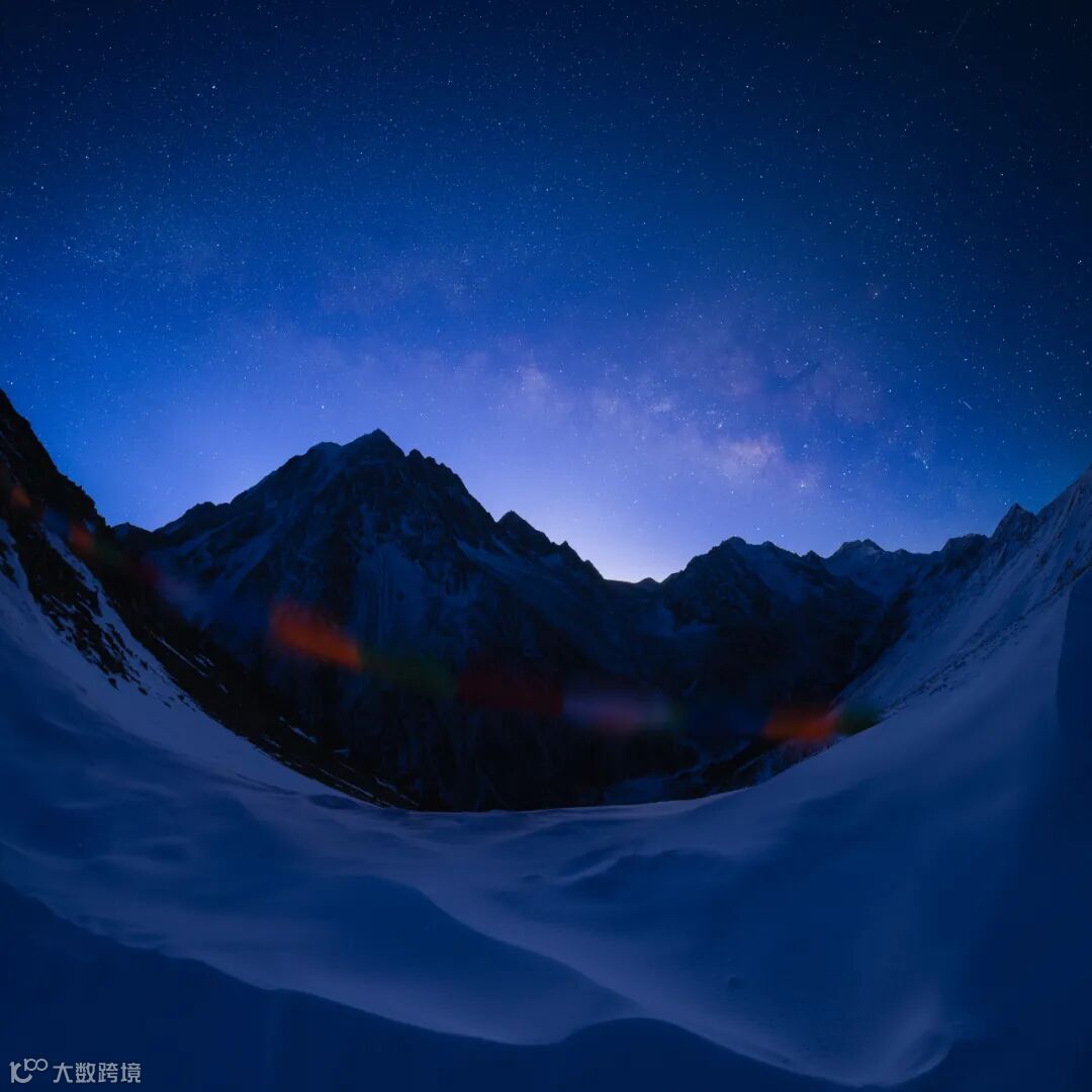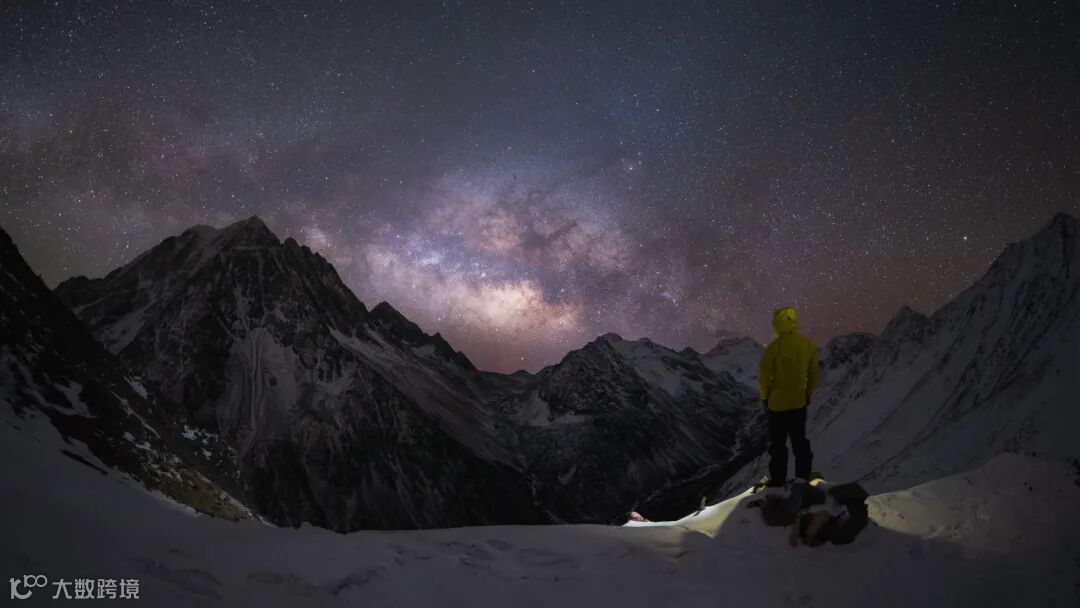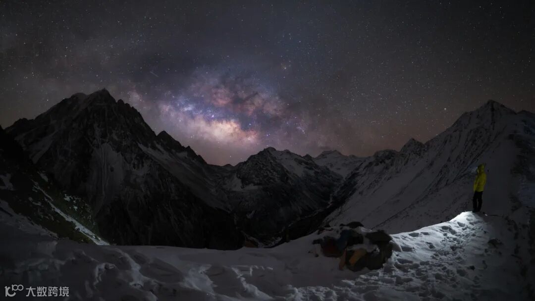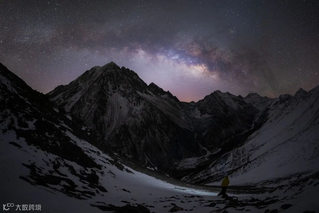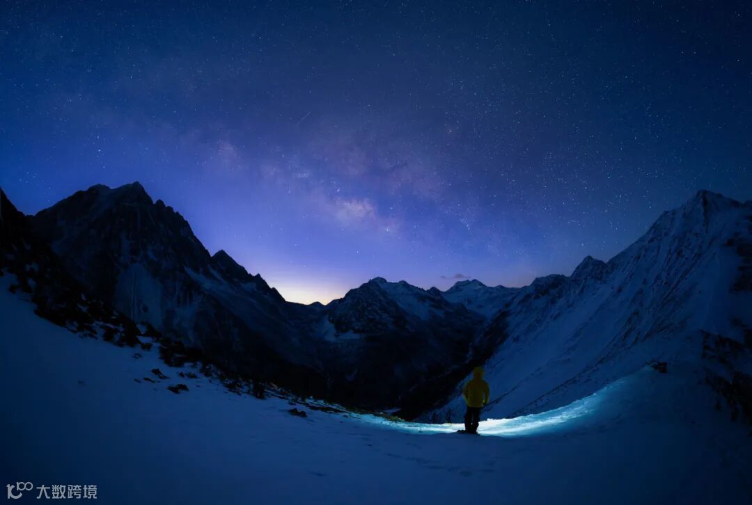 随后我将人物放在构图的右侧边缘,反方向看向远方群山和星辰。这是一个充满空间感的画面,远处的星空、中间的群山、近处的垭口雪地,以及人物和灯光照亮的脚印,共同记录了一个丰富而不混乱的星空世界。