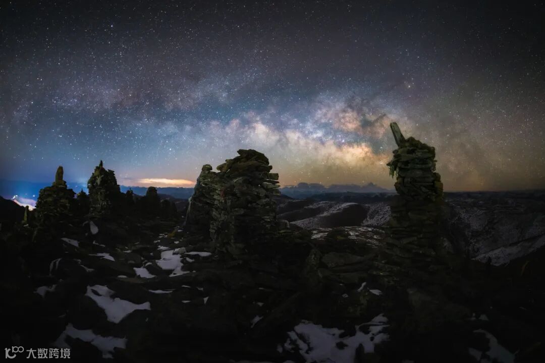 银河初升,横卧在雅拉雪山群山的山头,我站在垭口之巅,望向群山和星河。