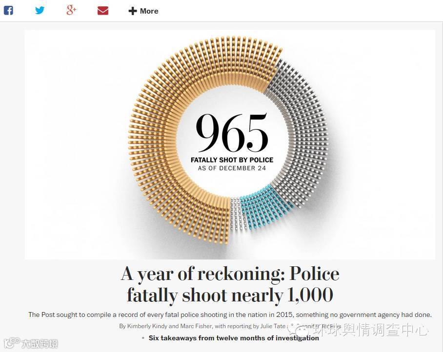 2016年普利策新闻奖将“全国报道奖”颁给了《华盛顿邮报》的一则数据新闻,获奖理由是:他们利用全国性的数据库,来分析警察开枪射击的频次和原因,并推测最有可能的受害者是谁,极具启发性。
