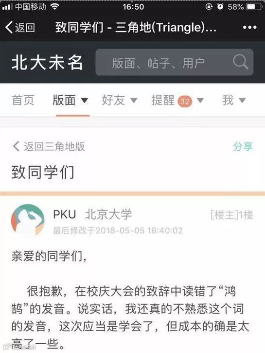 北大校长读错字,迅速成为互联网上的热点话题,他本人也成了舆论狂欢的消费对象。时隔一天,他公开道歉: