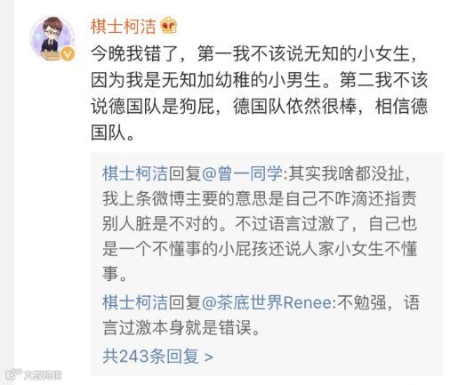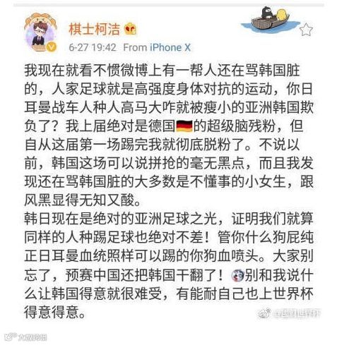 世界杯比赛中,德国小组赛惜败韩国,@棋士柯洁 因力挺韩国表现“毫无黑点”、是“亚洲足球之光”,招来网友指责。
