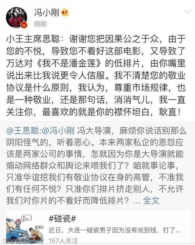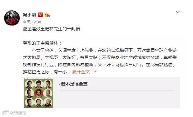 这种坍塌,绝非一夕之间。2016年,冯小刚在微博发表《潘金莲致王健林先生的一封信》,以小女子金莲的口吻反讽万达院线疑似压制《我不是潘金莲》排片一事。