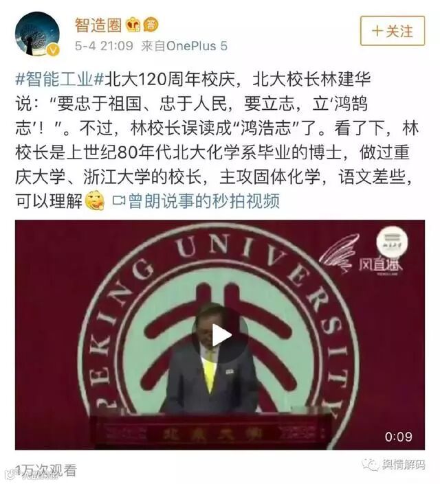 但此事也可以有被揪出来的理由,他毕竟是北大校长,“鸿鹄之志”的典故在中国社会相当普及,而且有网友指出,中央领导5月2号去北大和师生座谈时就讲到了青年人要立鸿鹄之志,林校长当时也在场,难道他座谈会的时候溜号了?