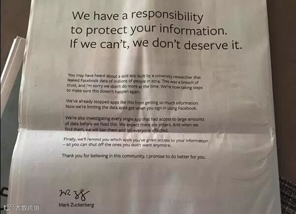小扎为了脸书间接泄露5000万用户数据之事,沉寂5天后买下9家报纸版面道歉:“我们有责任保护你们的信息。如果做不到这一点,就不配得到你们的信任。”