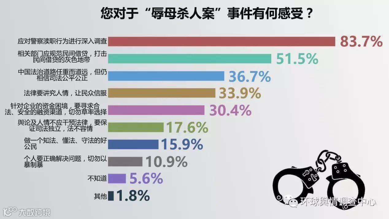 问及网民对于“辱母杀人案”的感受,超八成(83.7%)网民认为应该对警察渎职行为进行深入调查,选择比例最高;半数(51.5%)网民希望相关部门规范民间借贷,打击民间借贷的灰色地带。网民对剩余方面及选择比例由高到低分别为“中国法治道路任重而道远,但仍相信司法公平公正”(36.7%)、“法律要讲究人情,让民众信服”(33.9%)、“针对企业的资金困境,要寻求合法、安全的融资渠道,切勿草率选择”(30.4%)、“舆论及人情不应干预法律,要保证司法独立,法不容情”(17.6%)、“做一个知法、懂法、守法的好公民”(15.9%)、“个人要正确解决问题,切勿以暴制暴”(10.9%)。可以看出,网民对“警察渎职行为”最为关注,认为应对此进行深入调查,网民认为“辱母杀人案”的发生与警察的渎职行为有不可推脱的关系,同时此案件也让网民认为打击民间借贷灰色地带刻不容缓。