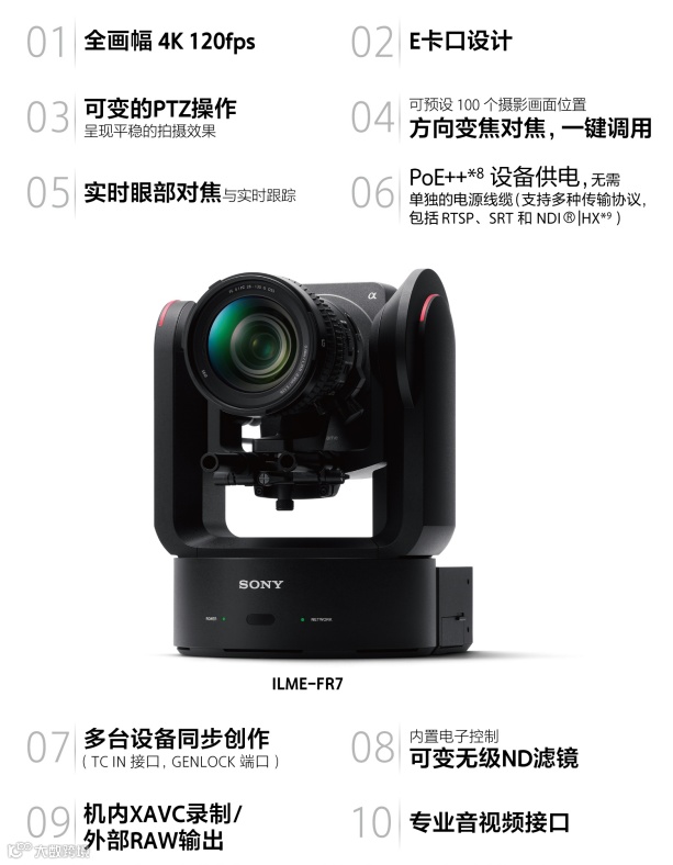 近年,远程遥控或在狭小空间下取景、捕捉高质量画面的需求急剧上升,索尼ILME-FR7应运而生。它是索尼首款¹集可换镜头设计、全画幅影像传感器以及内置旋转/俯仰/变焦(以下简称PTZ)功能于一体的遥控云台电影机。它不仅拥有出色的电影感画质,多功能连接性和PTZ等专业的操控性,为电影拍摄、现场内容制作和音乐视频制作,开启了创意自由度与电影感风格的新可能,进一步拓宽了影像制作行业的边界。