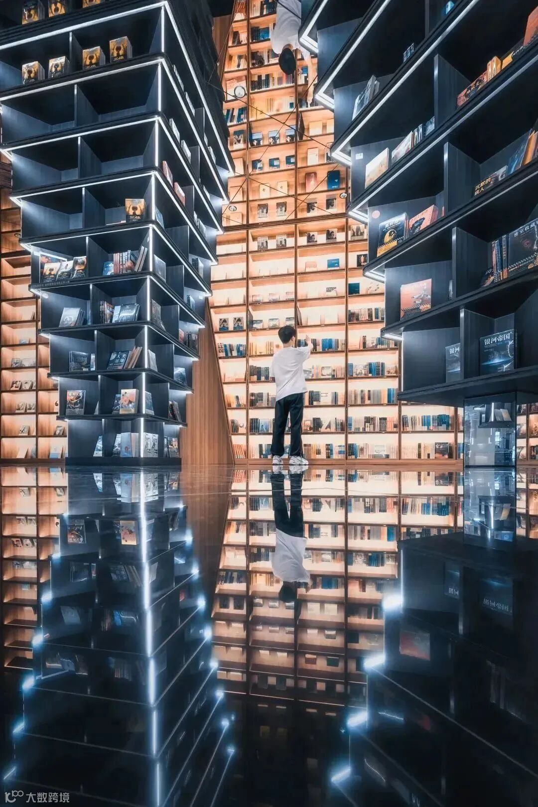 无论是哪里的钟书阁书店,都具有着很强的超现实主义风格。行走在由镜子组成的地面上,仿佛坠入了异次元空间。利用14mm的广角紧贴地面拍摄,可以获得更具张力的画面,让小伙伴出现在视觉的中心位置,借助倒影的反射让画面的视觉中心更为明确。