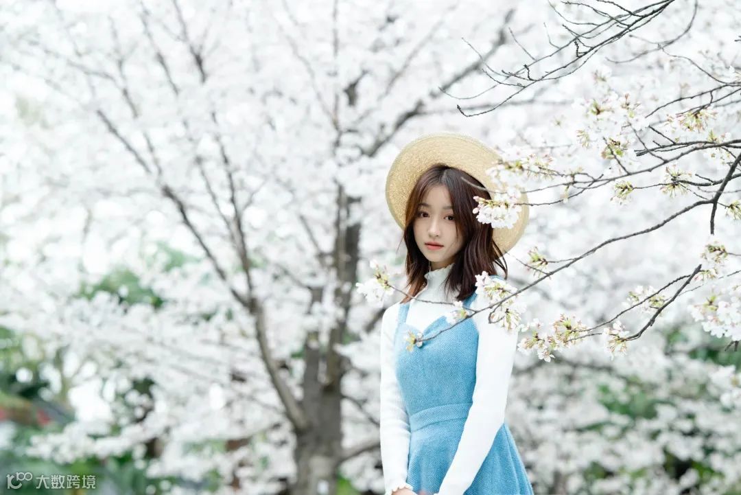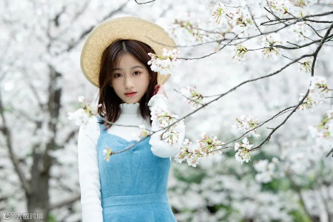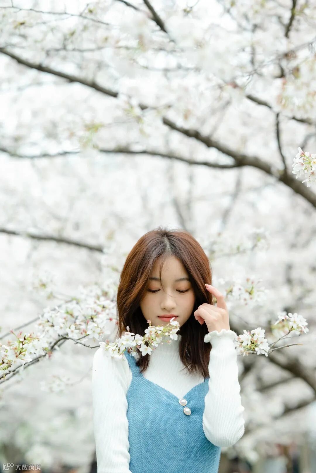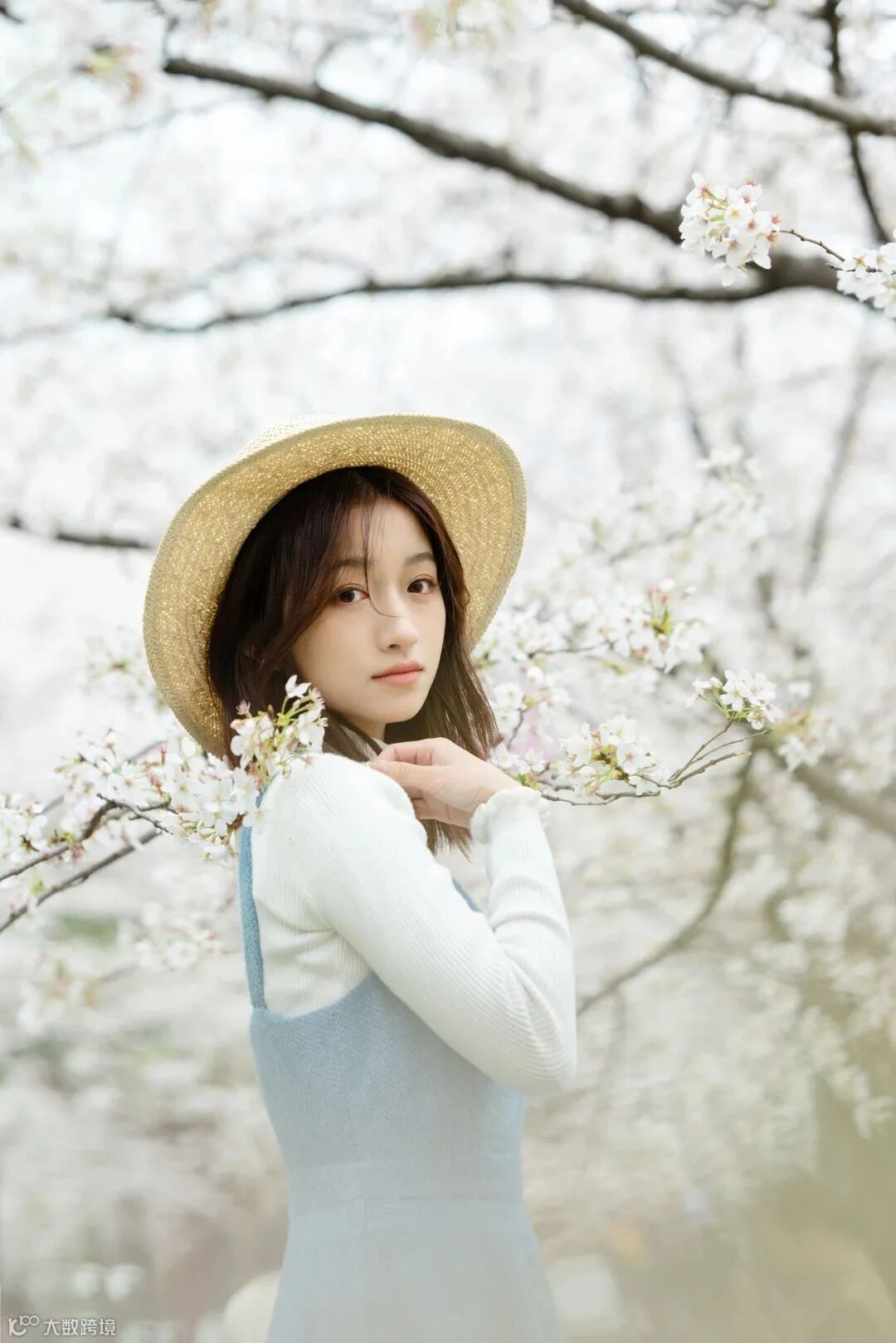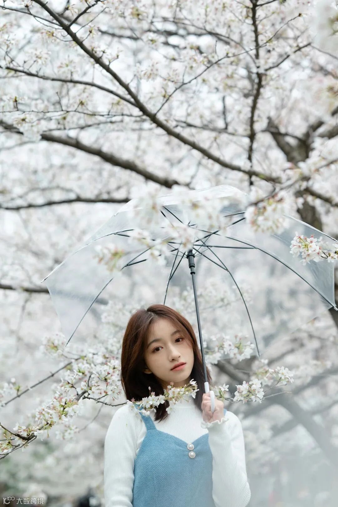 樱花多在高处开放,因此在构图时也有相应的技巧。一方面,可以适当用低角度仰拍,机位稍低于人眼,可以更好地营造人物在花海背景中的效果,同时还能巧妙地躲避开地面的杂物或游客。此外,还可以找一些恰当的枝芽作为前景,让画面更具层次感。再配上色彩淡雅的草帽和透镜雨伞,更为画面增添清新的气息。