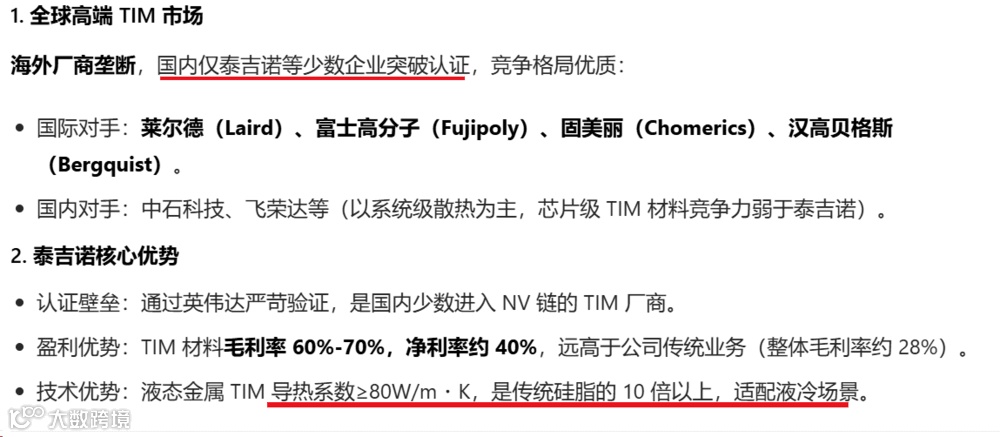 国家级专精特新 “小巨人” 企业,主营高端电子封装材料,覆盖集成电路、智能终端、新能源、高端装备四大领域,是国内电子封装材料龙头。2024 年 12 月收购泰吉诺,切入 AI 服务器高端散热赛道。泰吉诺核心业务是高端导热界面材料(TIM)研发、生产与销售,是英伟达 AI 服务器 TIM 材料核心供应商。