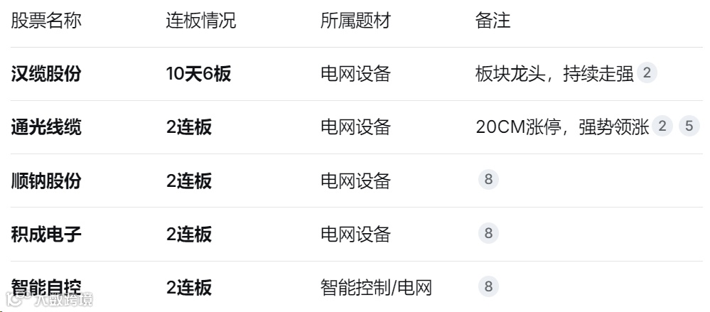 今日连板股的核心题材是电网设备,受北美缺电逻辑、美国大规模输电扩容项目(750亿美元)以及国内电力设备出口订单预期等多重因素驱动,该板块成为近期市场最具持续性的热点。汉缆股份走出10天6板的高度,通光线缆、顺钠股份等一批2连板个股形成梯队,显示资金对该题材的深度介入。