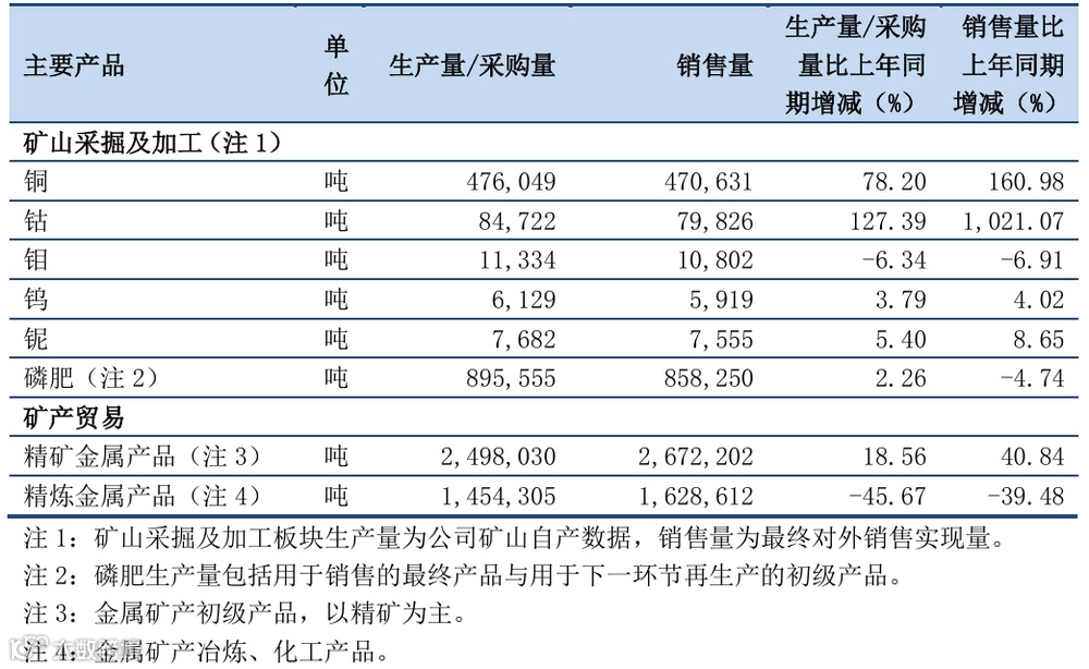目前,洛阳钼业间接持有刚果(金)TFM铜钴矿80%权益,该矿区面积超过1500平方公里,涉及铜、钴矿的勘探、开采、提炼和加工,主要产品为阴极铜和氢氧化钴。此外,洛阳钼业还间接持有KFM矿71.25%的权益,KFM项目自2023年第二季度达产,主要产品为阴极铜、氢氧化钴以及少量硫化铜钴精矿。