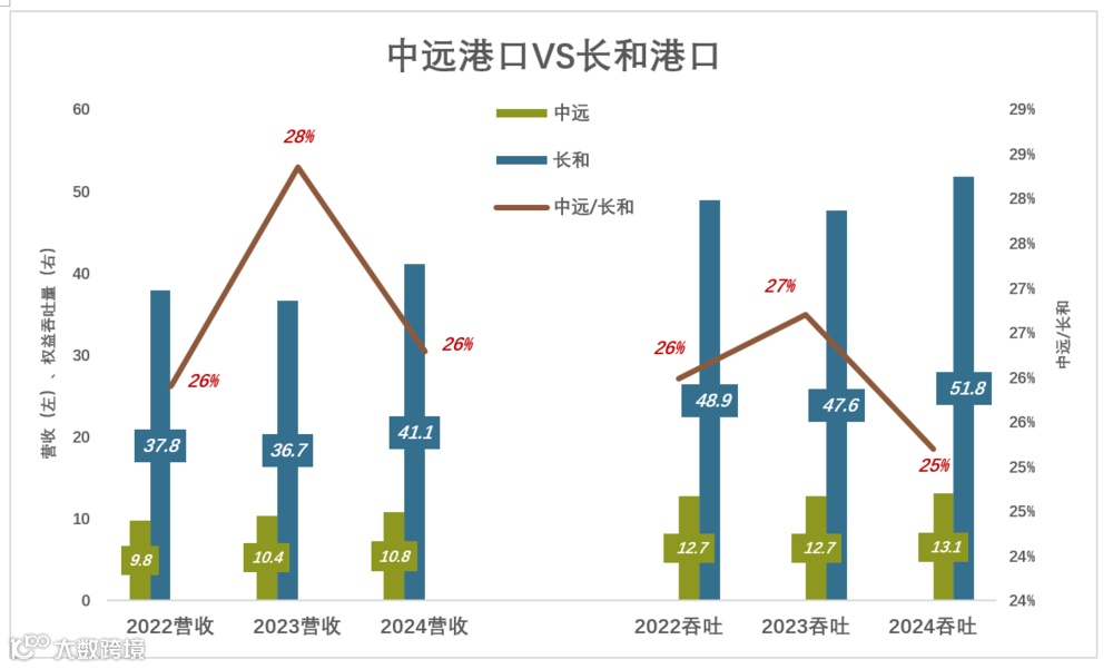 例如2024年,中远港口总吞吐量1.44亿标准箱,权益吞吐量4532万标准箱,其中3228万标准箱来自中国地区港口,占比达71.2%;仅1274万标准箱来自海外港口/泊位,相当于长和港口海外吞吐量的24.5%。