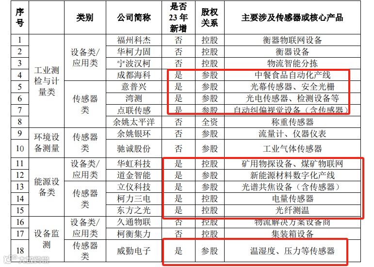 2023年柯力传感投资11家企业,先后布局电量传感器、光栅传感器、中餐自动化产线、新能源负极材料企业等,切入更多的细分赛道,向多物理量传感器平台型企业转型。