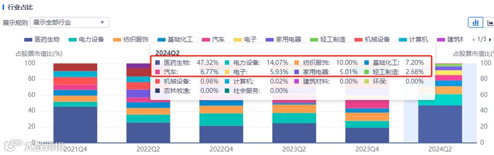 且2024年2季度该基金的第一大重仓股,还是非医药领域做轻奢服装的比音勒芬。同时,第五大、第八大、第九大重仓股分别是:锂电龙头宁德时代、光伏领域碳基材料龙头金博股份以及化工领域炭黑龙头黑猫股份(2023年新增新能源概念,导电炭黑可应用于锂电)。