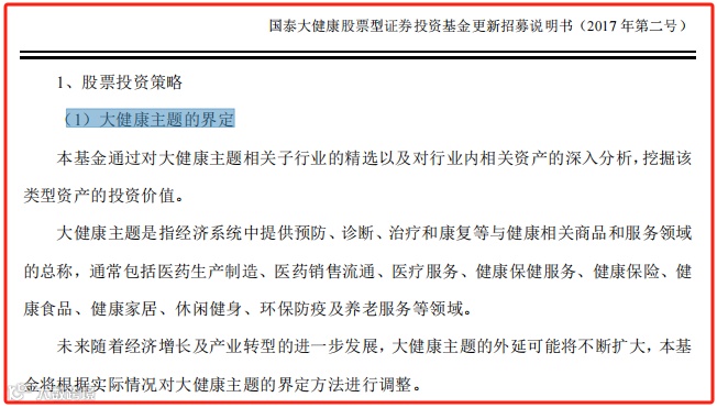 从该基金投资目标看,主要投资于大健康主题股票。结合招募说明书中关于大健康主题界定是指提供预防、诊断、治疗和康复等与健康相关商品和服务领域的总称,以及该基金业绩比较基准是“中证健康产业指数收益率*80%+中证综合债指数收益率*20%”看,它应该是一只医药健康类的主题产品。