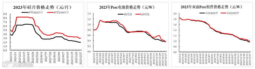 根据第三方机构Infolink价格统计,182尺寸PERC电池2023年末市场成交均价为0.36元/W,较年内高点1.14元/W下跌68%;182尺寸PERC组件2023年末市场成交均价0.95元/W,较年内高点1.83元/W下跌48%。
