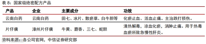 在产品方面,片仔癀为国家绝密级配方,产品护城河深厚。国家绝密级配方保密期限为永久,目前只有两个配方(云南白药和片仔癀)纳入,两者在成分、疗效和针对适应症均有明显差异。同时,片仔癀也是国家一级中药保护品种,其传统制作技艺被列入国家非遗名录。